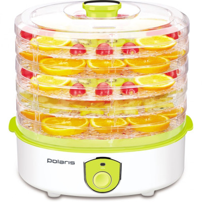 Сушилка для овощей и фруктов Polaris PFD 2205D в симпатичном бело-зеленом корпусе обладает прозрачной рабочей емкостью из пластика.