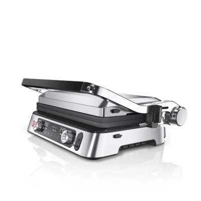 Мультигриль Braun CG9047 – это стиль и функциональность на вашей кухне. В комплект входят две съемные пластины с антипригарным покрытием. Рифленая подойдет для стейков, птицы и рыбы, на гладкой удобно жарить яичницу, овощи и морепродукты. Температура нагрева задается в диапазоне от 60 до 250 градусов отдельно для каждой поверхности при помощи поворотных регуляторов. Прибор оповестит о готовности к работе звуковым сигналом – пора приступать к закладке продуктов! Задать продолжительность приготовления можно при помощи таймера. Стейки получатся сочные внутри и с золотистой корочкой снаружи. Все параметры работы и активные установки гриля отображает встроенный дисплей. Излишки жира стекают в специальный поддон. Он, как и пластины, легко снимается для очистки. Пластины можно мыть в посудомоечной машине. Используйте открытое положение для атмосферы барбекю с двумя открытыми варочными поверхностями. Готовьте стейки и овощи одновременно